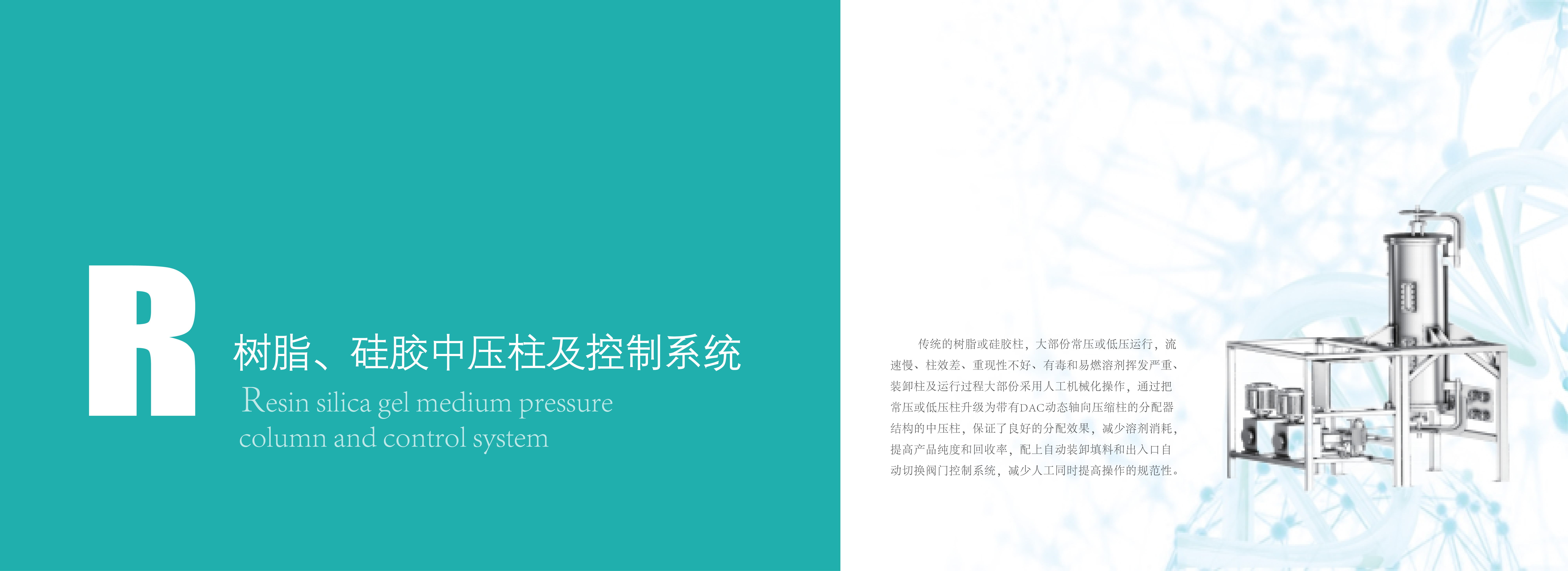 傳統(tǒng)的樹脂或硅膠柱,大部份常壓或低壓運(yùn)行,流速慢、柱效差、重現(xiàn)性不好、有毒和易燃溶劑揮發(fā)嚴(yán)重、裝卸柱及運(yùn)行過程大部份采用人工機(jī)械化操作,通過把常壓或低壓柱升降為帶有DAC動(dòng)態(tài)軸向壓縮柱的分配器結(jié)構(gòu)的中壓柱,保證了良好的分配效果,減少溶劑消耗,提高產(chǎn)品純度和回收率,配上自動(dòng)裝卸填料和出入口自動(dòng)切換閥門控制系統(tǒng),減少人工同時(shí)提高操作的規(guī)范性。