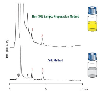圖5給出了另一個示例。靠上的譜圖表明化合物#1和#2均受到樣品基質引起的明顯干擾??肯碌淖V圖表明使用SPE進行適當樣品制備后可顯著提高結果質量(基線干凈)。請注意,一條明顯更干凈的基線可提高分析結果的準確度。如果該樣品需要對化合物進行分離和純化,那么也可以獲得一種純度明顯更高的萃取物。
