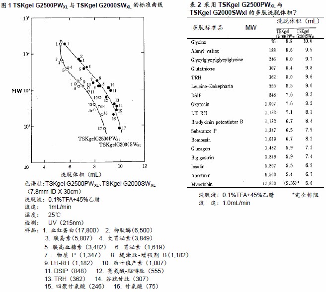 ??? 表2所示為各多肽標準液的洗脫體積,圖1所示為標準曲線。洗脫液采用含有45%乙腈的0.1%TFA溶液。所有TSKgel G2000SWXL的樣品洗脫速度均慢于TSKgel G2500PWXL。同時,在TSKgel G2000SWXL中,肌球蛋白(MW17800)進入填充劑的小孔內部,但在TSKgel G2500PWXL中,肌球蛋白被小孔排阻,從外水體積中被洗脫。根據(jù)其結果,可認為TSKgel G2500PWXL在上述洗脫液條件下的多肽分子量排阻界限推測為8000,相比之下,硅膠型填充劑TSKgel G2000SWXL,可適用于從低分子量到高分子量區(qū)域更廣的范圍。