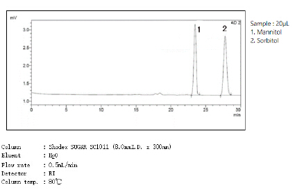 歐洲藥典EP和日本藥典JP規(guī)定,分析甘露醇使用Ca型強陽離子交換柱,色譜柱尺寸7.8*300mm,甘露醇與山梨醇的分離度達到2以上。同樣對應(yīng)Shodex SUGAR SC1011-7F,能夠符合歐洲藥典/日本藥典的要求。