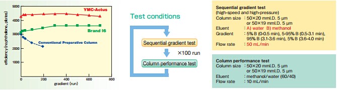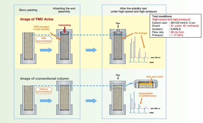 1. 應用動態(tài)軸向壓縮柱技術的制備用填充柱,在柱端裝備時進行適度加壓。因此,裝填密度比過去的產(chǎn)品約上升10%。